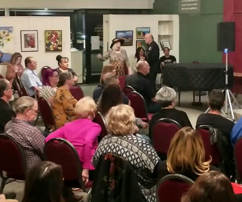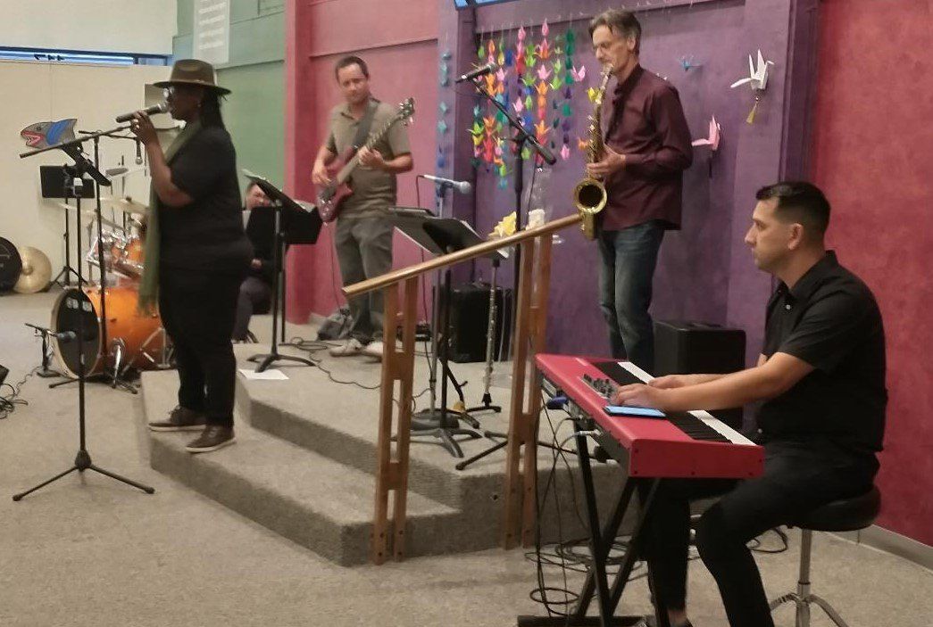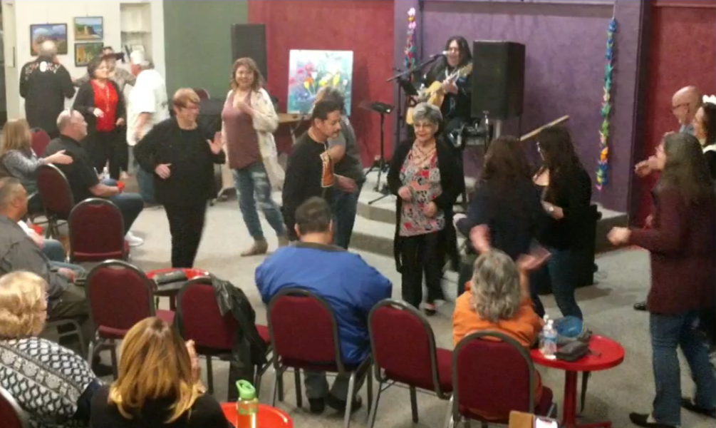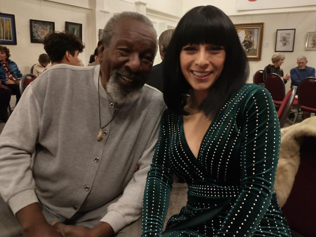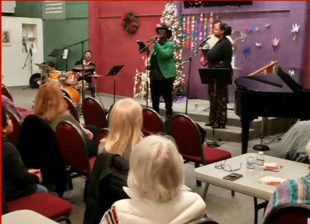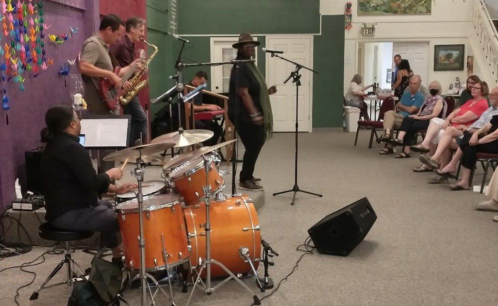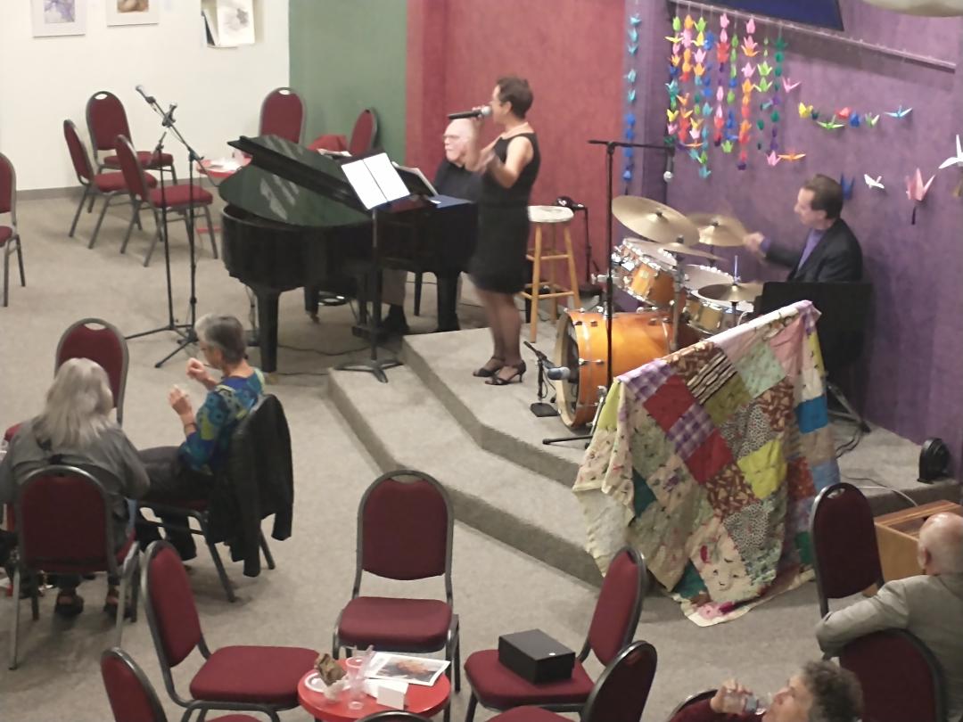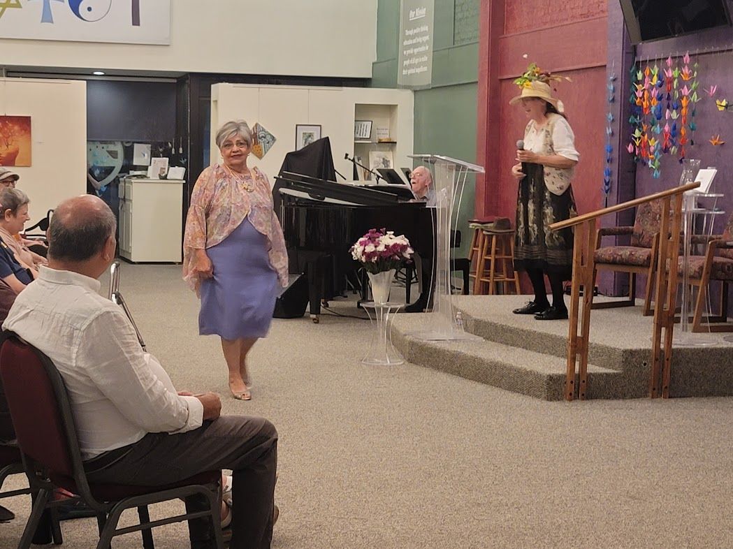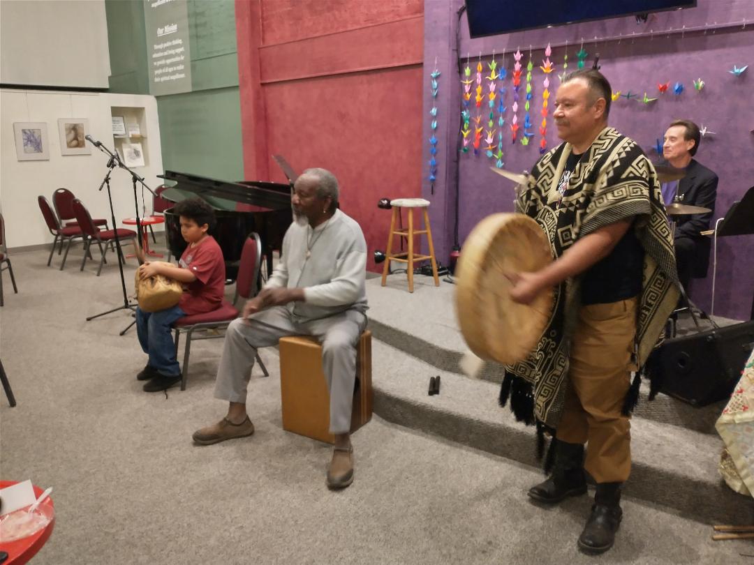 Buddy Jones has been chosen to receive the Marjorie Brandon Award in recognition of his lifetime devotion to making this community a better place. Pictured Buddy plays drum with Tino, Buddy with Rosalinda Verde (last year's winner of the MB Award), and Deanna Saldana with Bruce Huddleston (piano) and Joe Lizama (drums) at the presentation event on November 5, 2022, here at the Center for Spiritual Living Visalia.